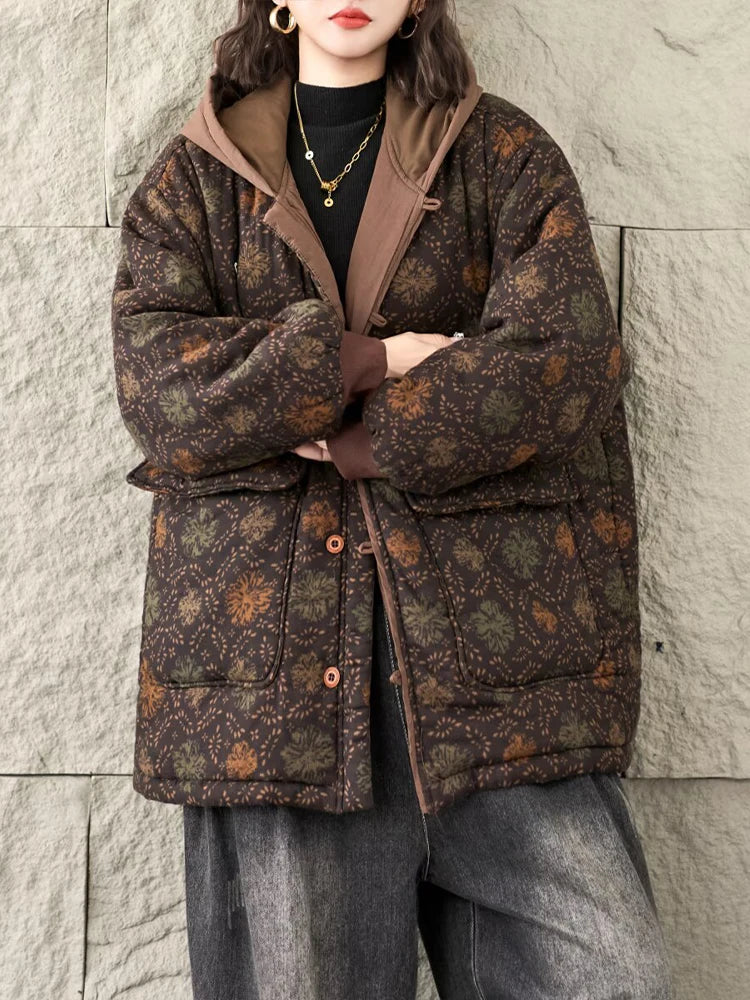 Floral Winter Warm Cotton Coats Ladies Oversized Printed Hooded Parkas Women Vintage Punk Thicken Padded Jackets
